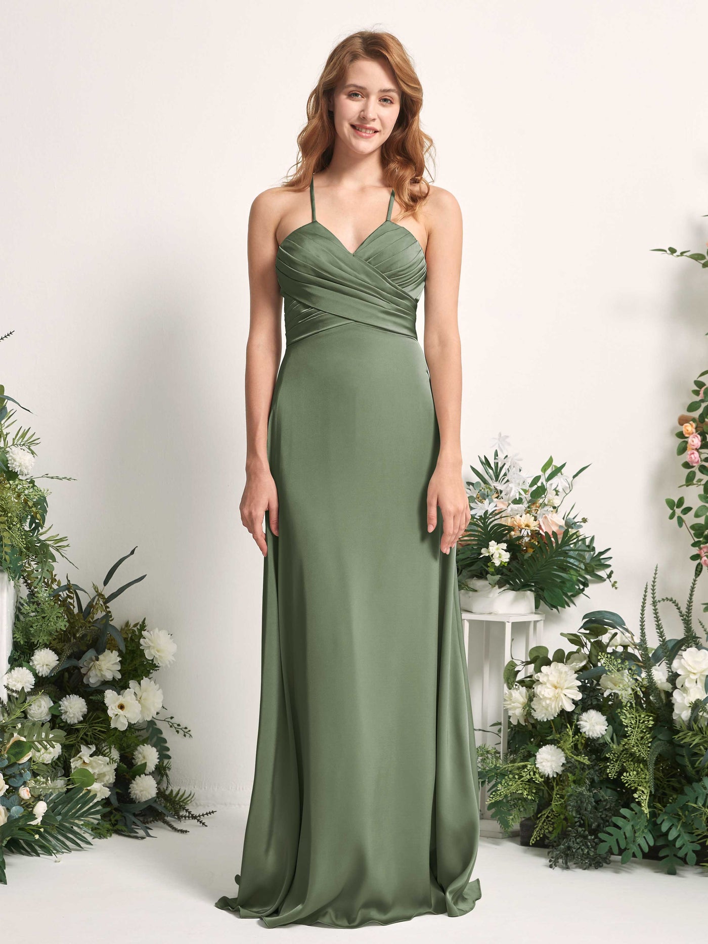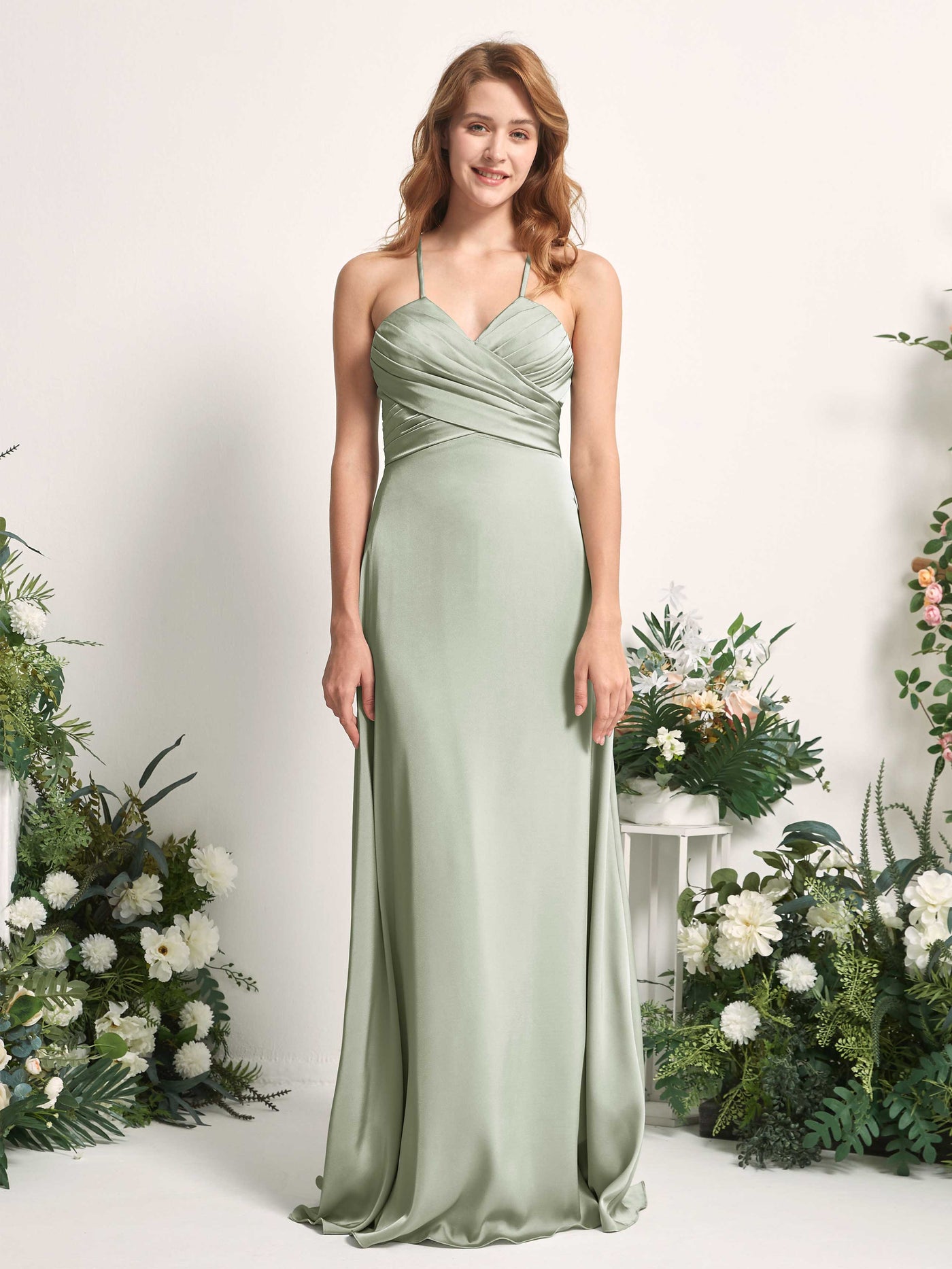 Carlyna Allison A-Line Sage Green Satin Bridesmaid Dress Maxi Sleeveless V-Neck Dress Front View