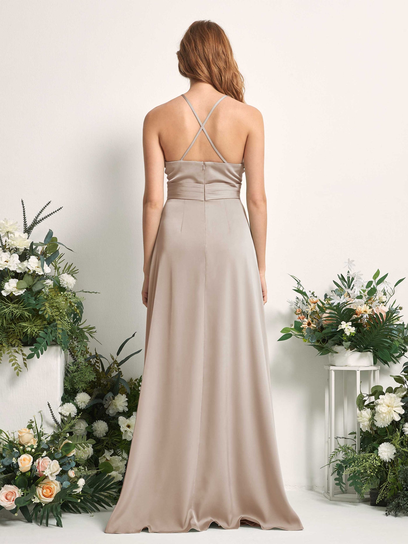 Carlyna Allison A-Line Taupe Satin Bridesmaid Dress Maxi Sleeveless V-Neck Dress Front View