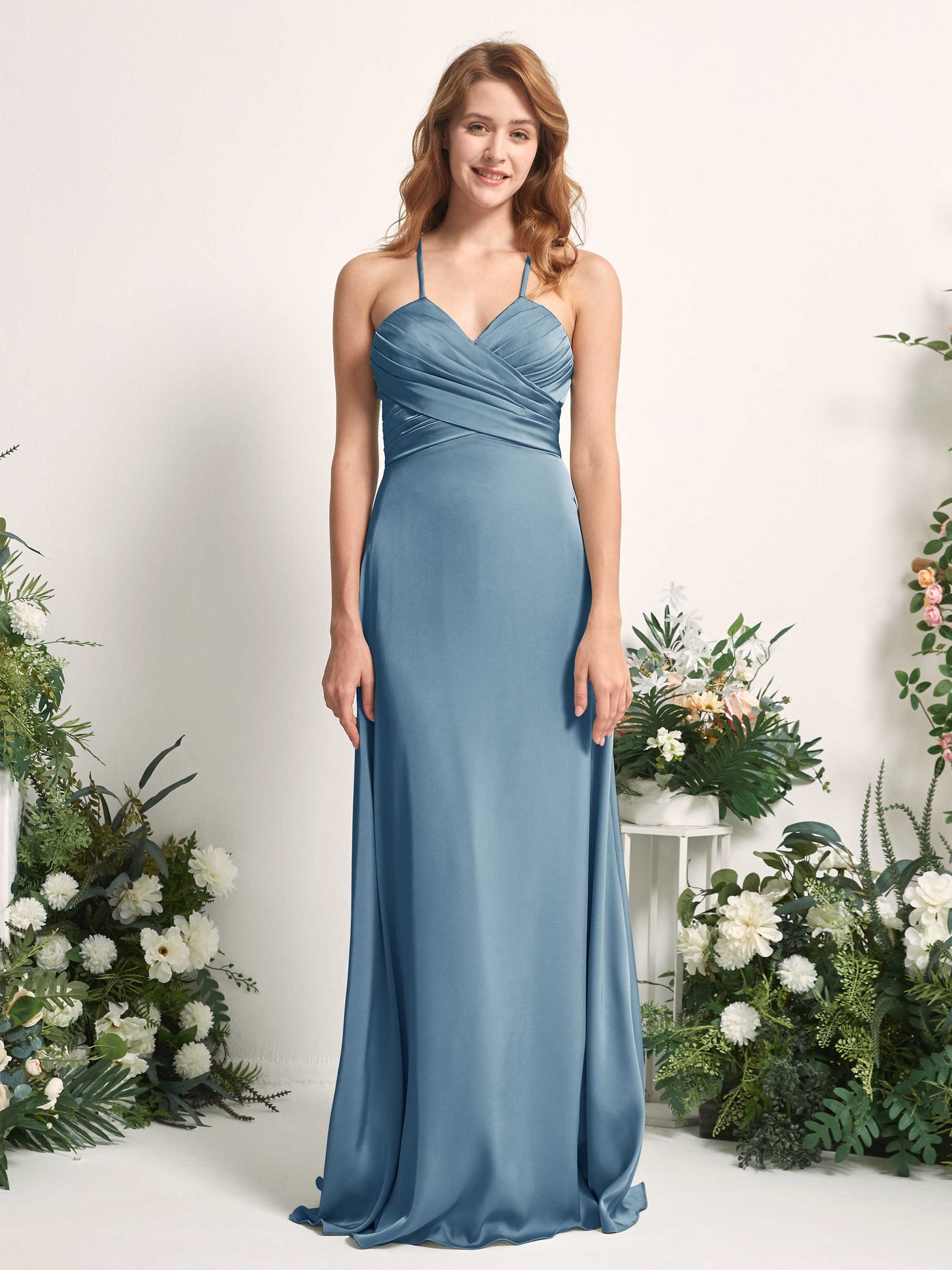 Carlyna Allison A-Line Dusty Blue Satin Bridesmaid Dress Maxi Sleeveless V-Neck Dress Front View