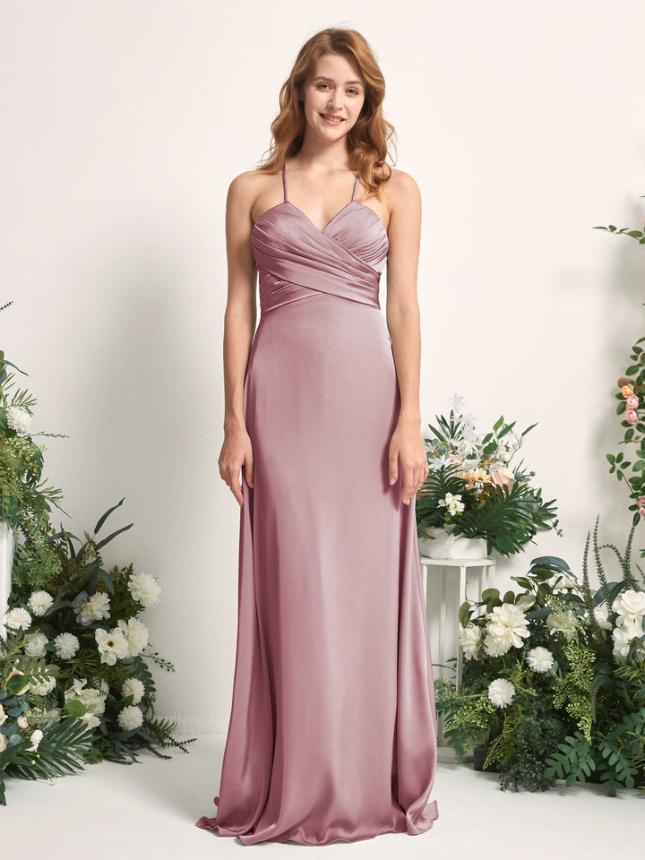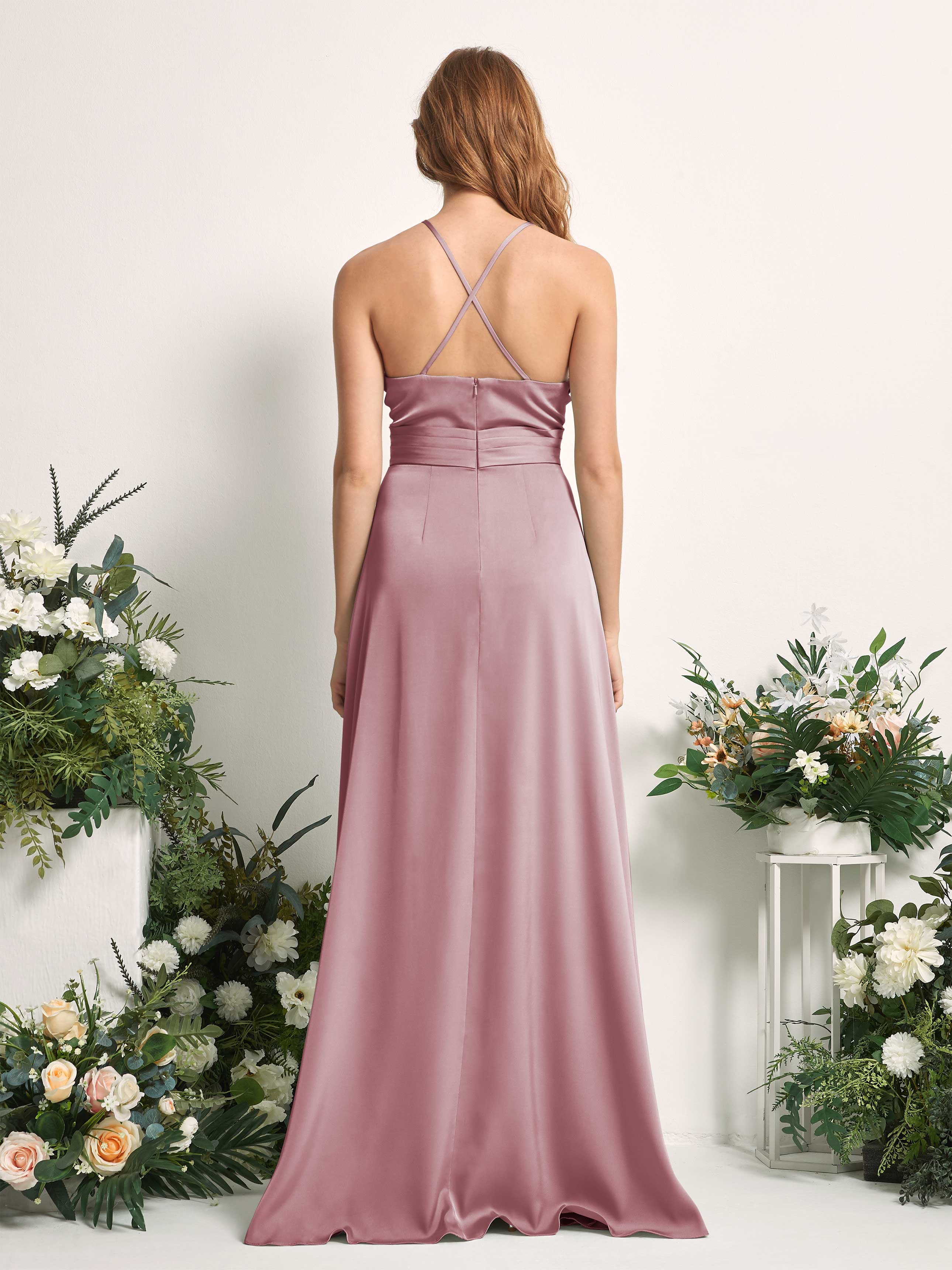 Carlyna Allison A-Line Dusty Rose Satin Bridesmaid Dress Maxi Sleeveless V-Neck Dress Front View