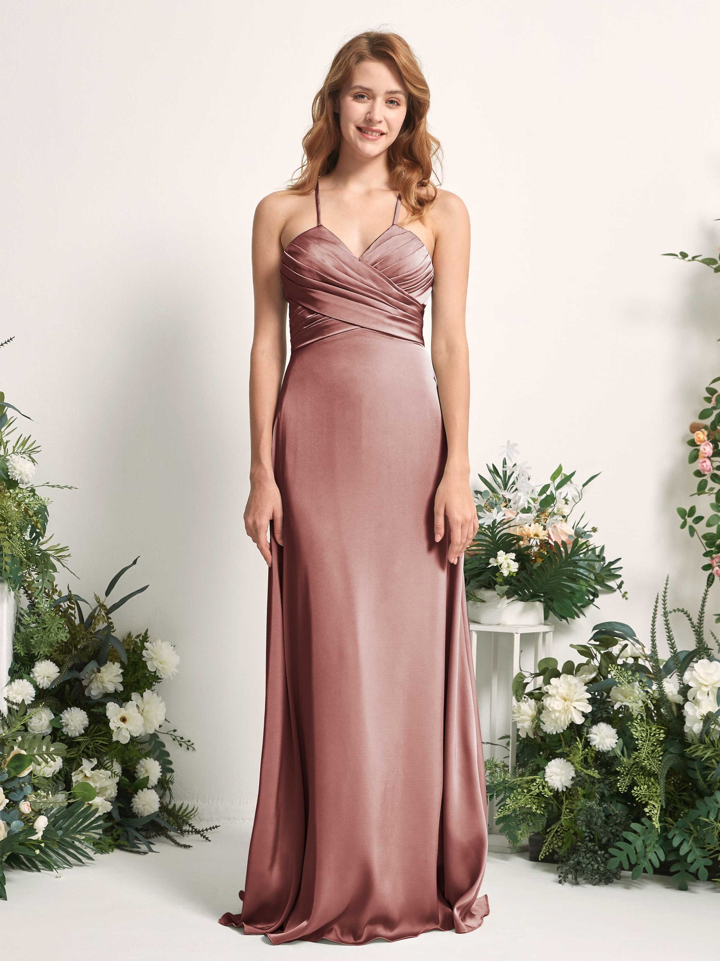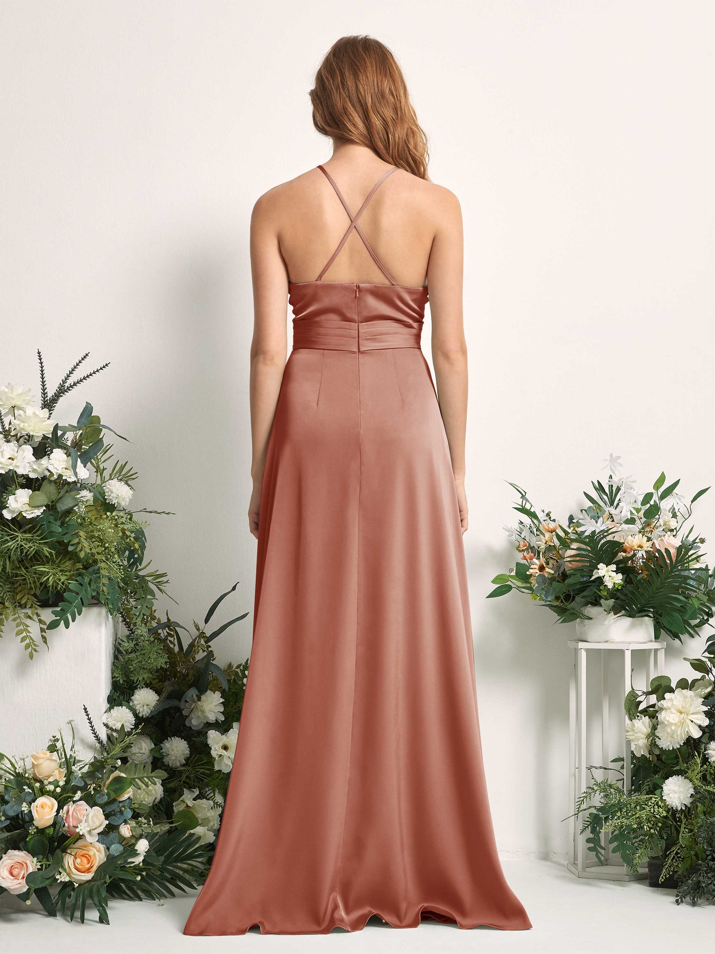 Carlyna Allison A-Line Desert Rose Satin Bridesmaid Dress Maxi Sleeveless V-Neck Dress Front View