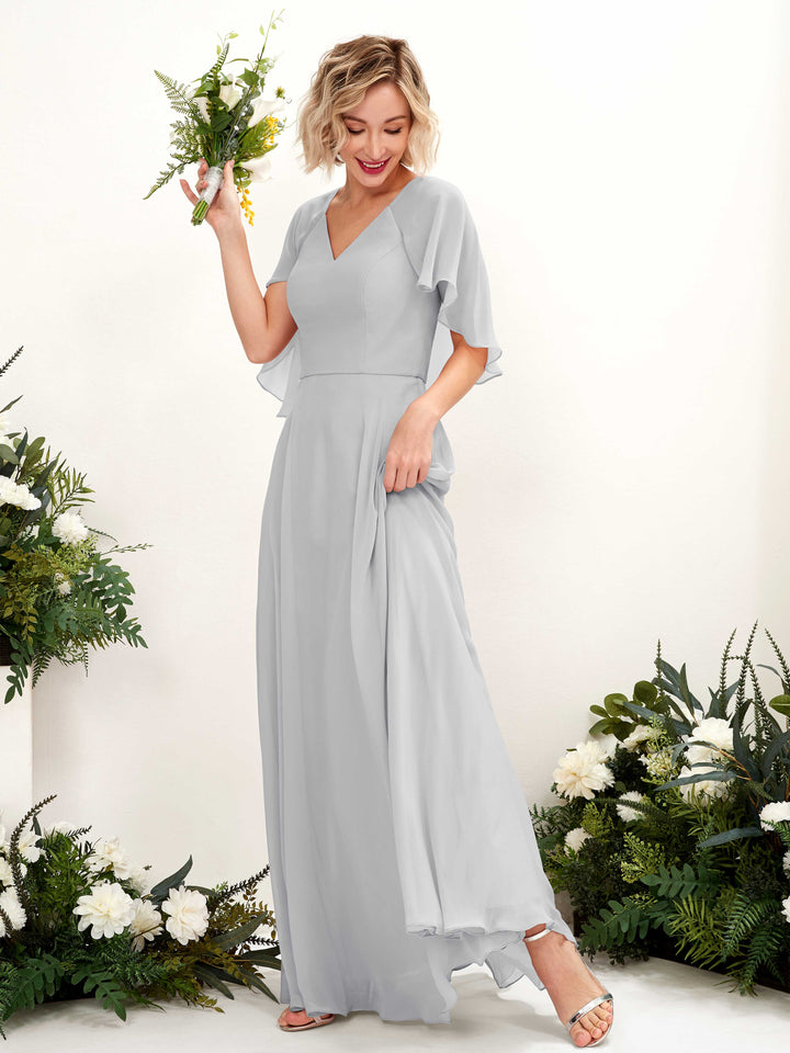 Carlyna Winnie A-Line Silver Bridesmaid Dress Maxi Short Sleeve V-Neck Dress
