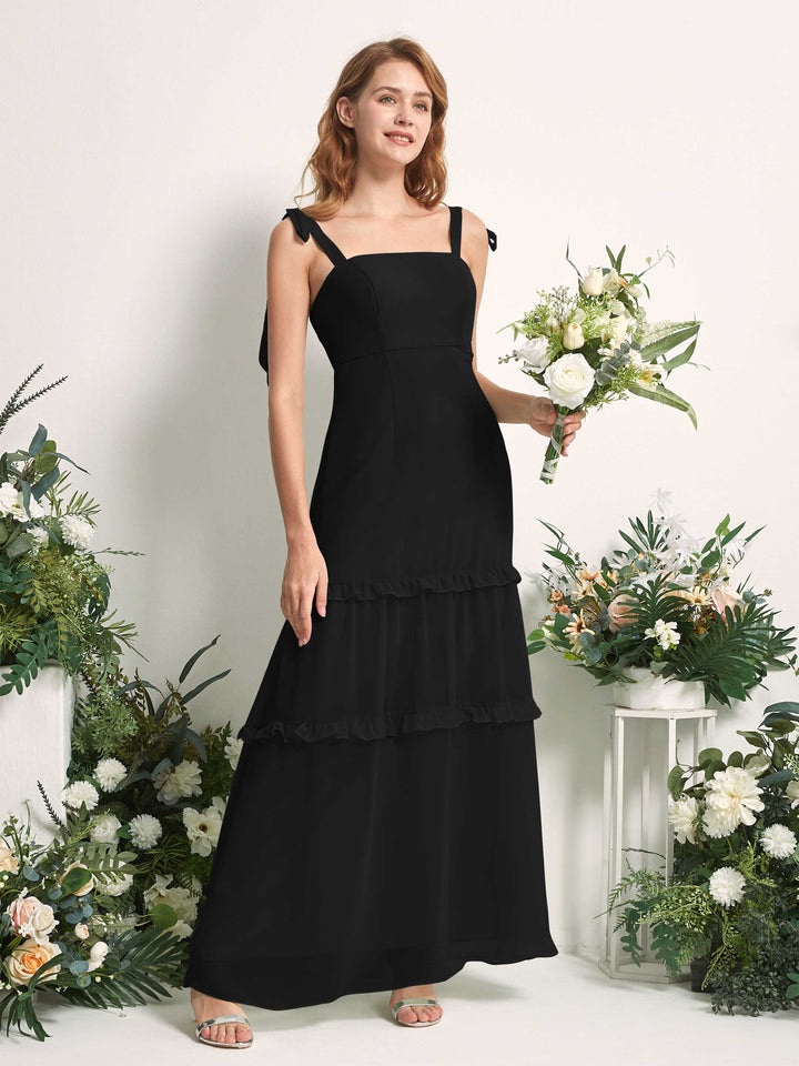 The Kaiya Chiffon Dress is a stunning sleeveless maxi with a flowing silhouette. Featuring a straight neckline, spaghetti straps, and delicate ruffles, this A-line dress is perfect for bridesmaids. Available in a variety of colors.