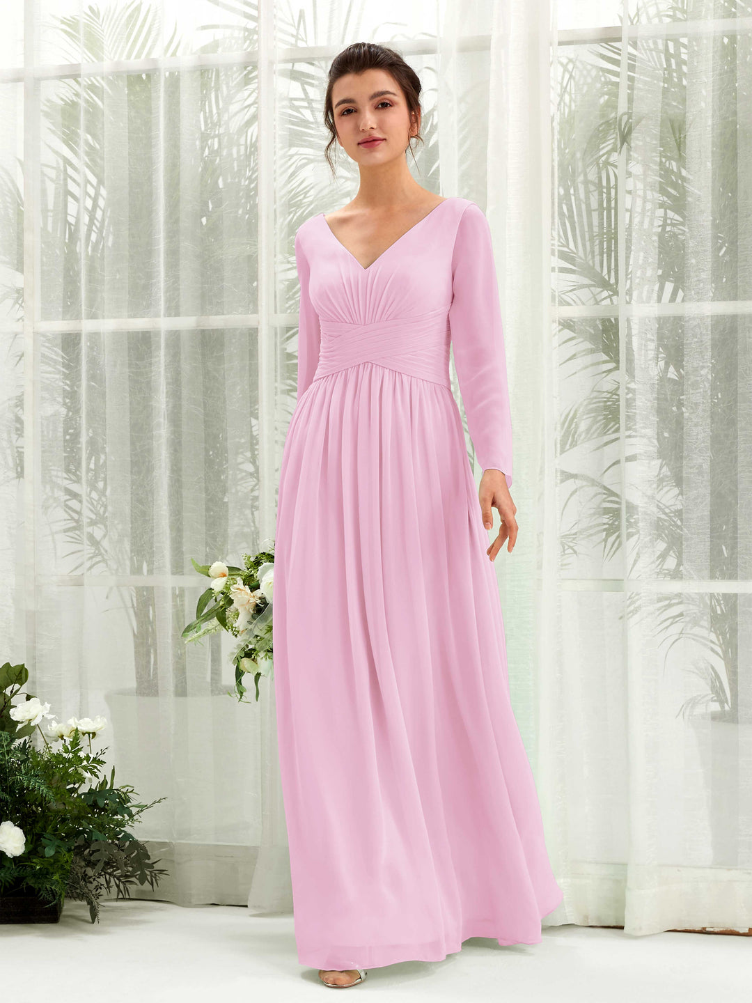 Carlyna Coline A-Line Ballet Pink Bridesmaid Dress Maxi Long Sleeve V-Neck Front View