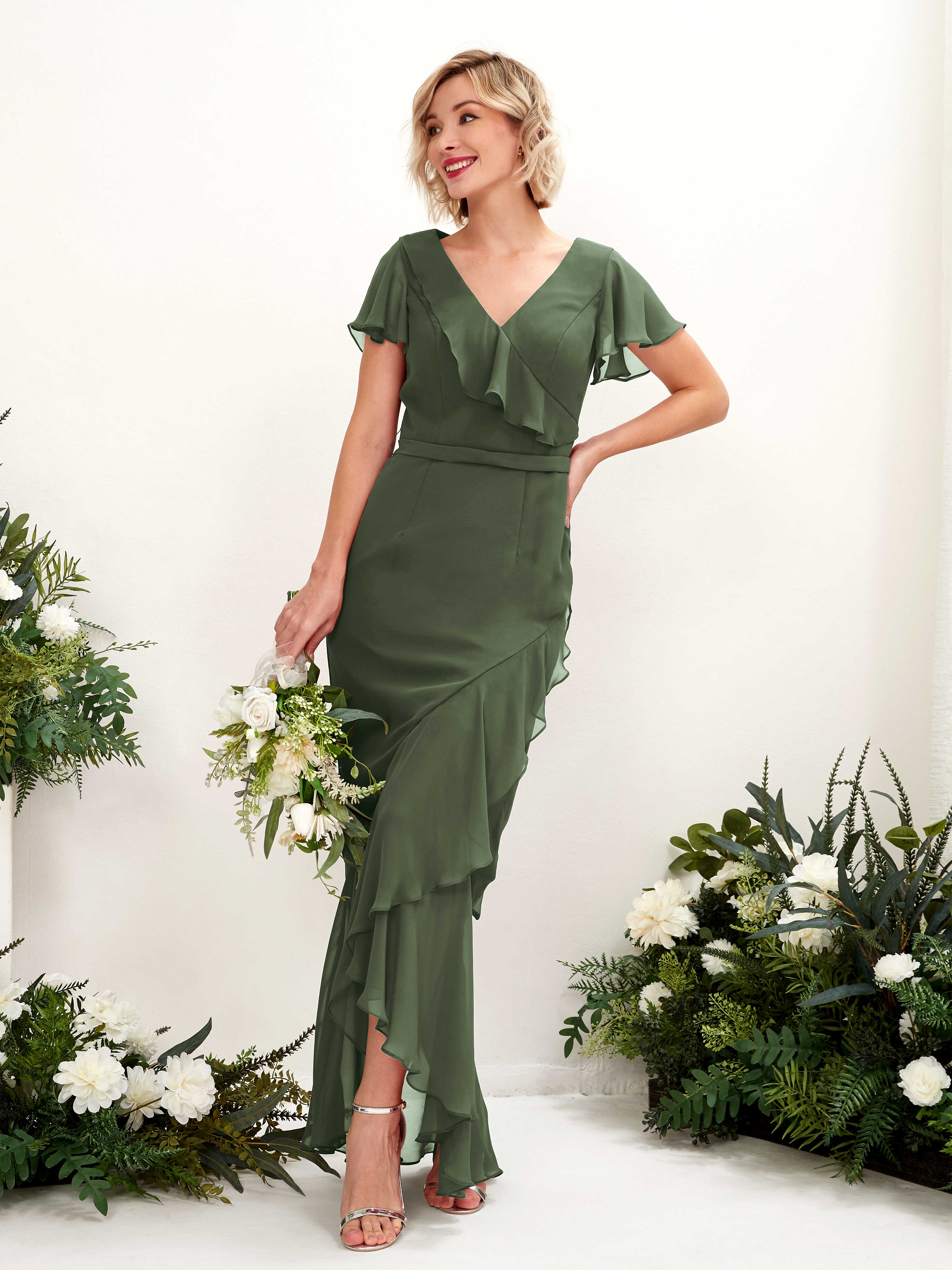 Carlyna Eartha Mermaid Martini Olive Bridesmaid Dress Maxi Cap Sleeve V-Neck Dress Front View