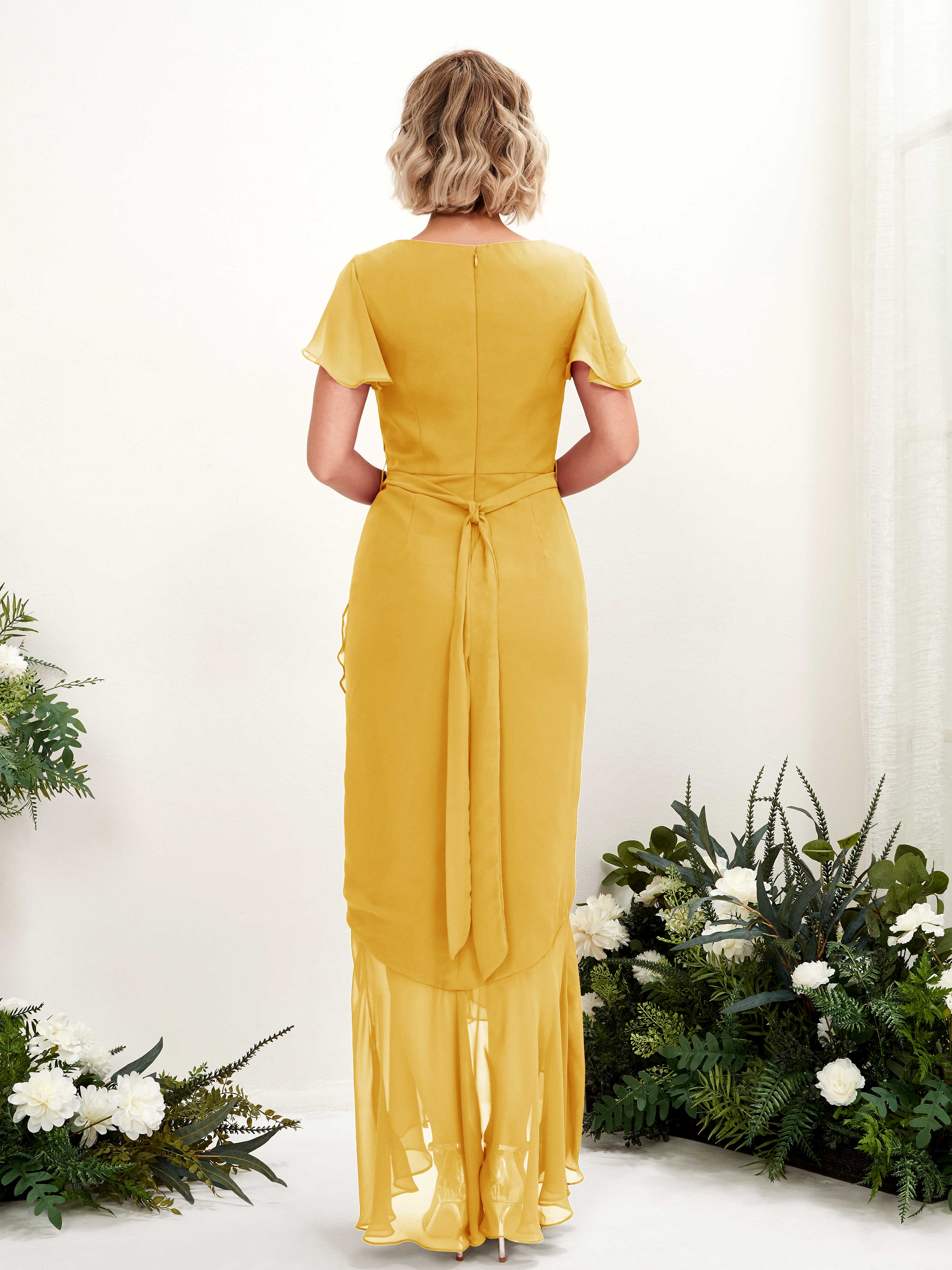 Carlyna Eartha Mermaid Mustard Yellow Bridesmaid Dress Maxi Cap Sleeve V-Neck Dress Back View