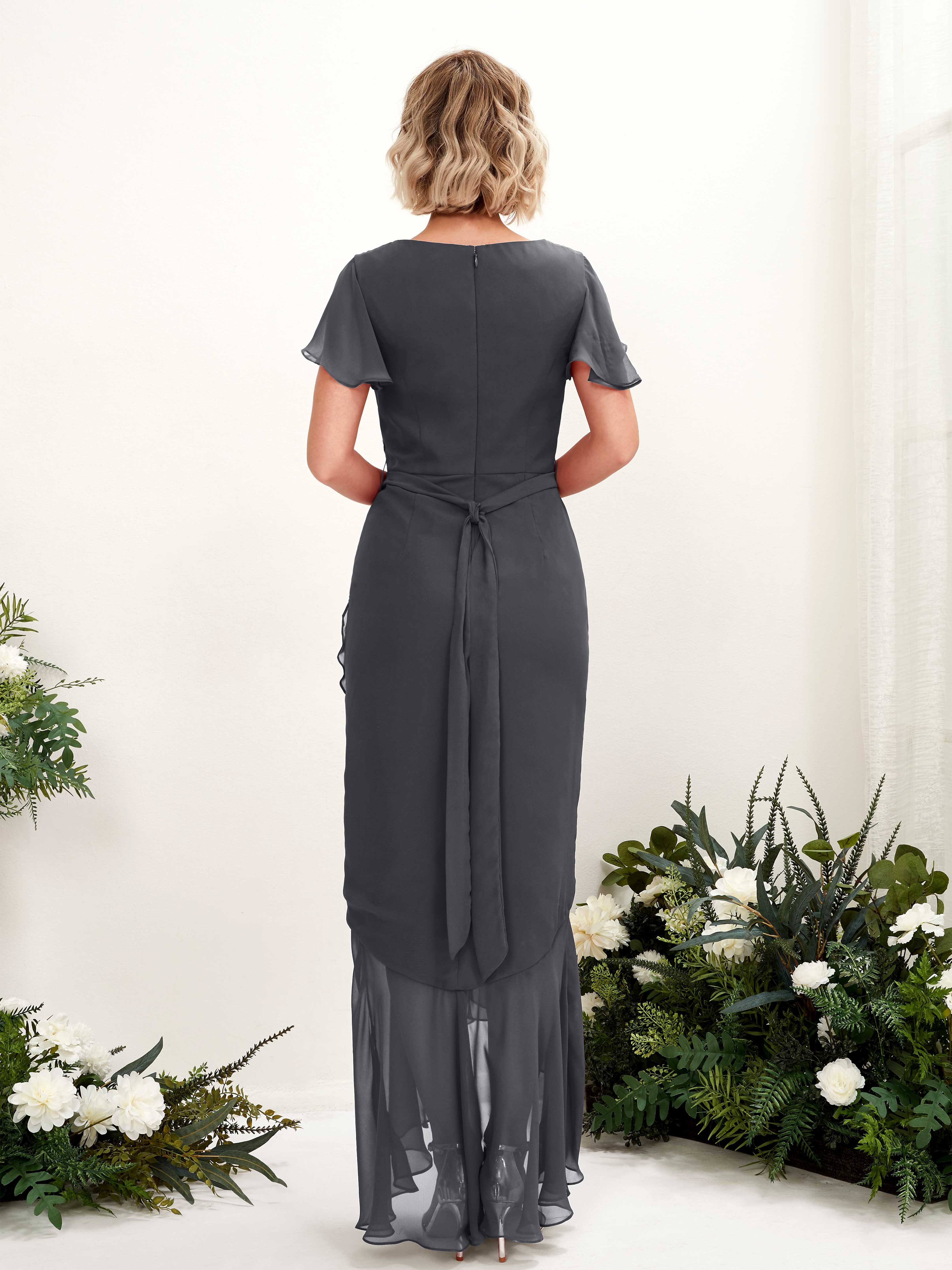 Carlyna Eartha Mermaid Steel Gray Bridesmaid Dress Maxi Cap Sleeve V-Neck Dress Back View