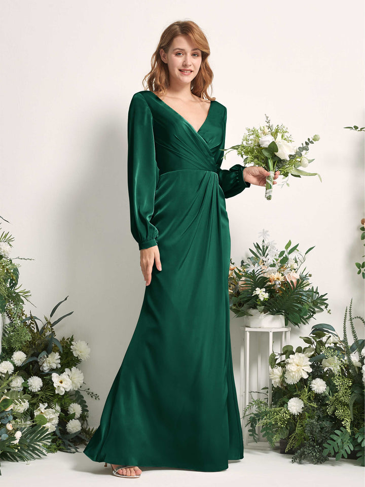 Carlyna Taylor Mermaid Hunter Green Satin Bridesmaid Dress Maxi Long Sleeve V-Neck