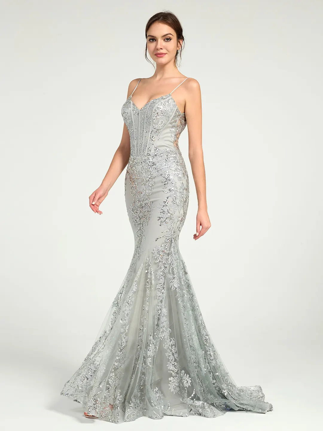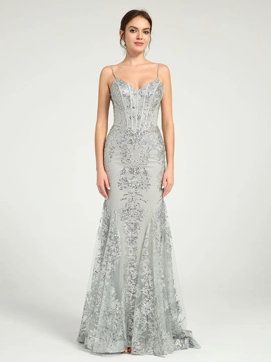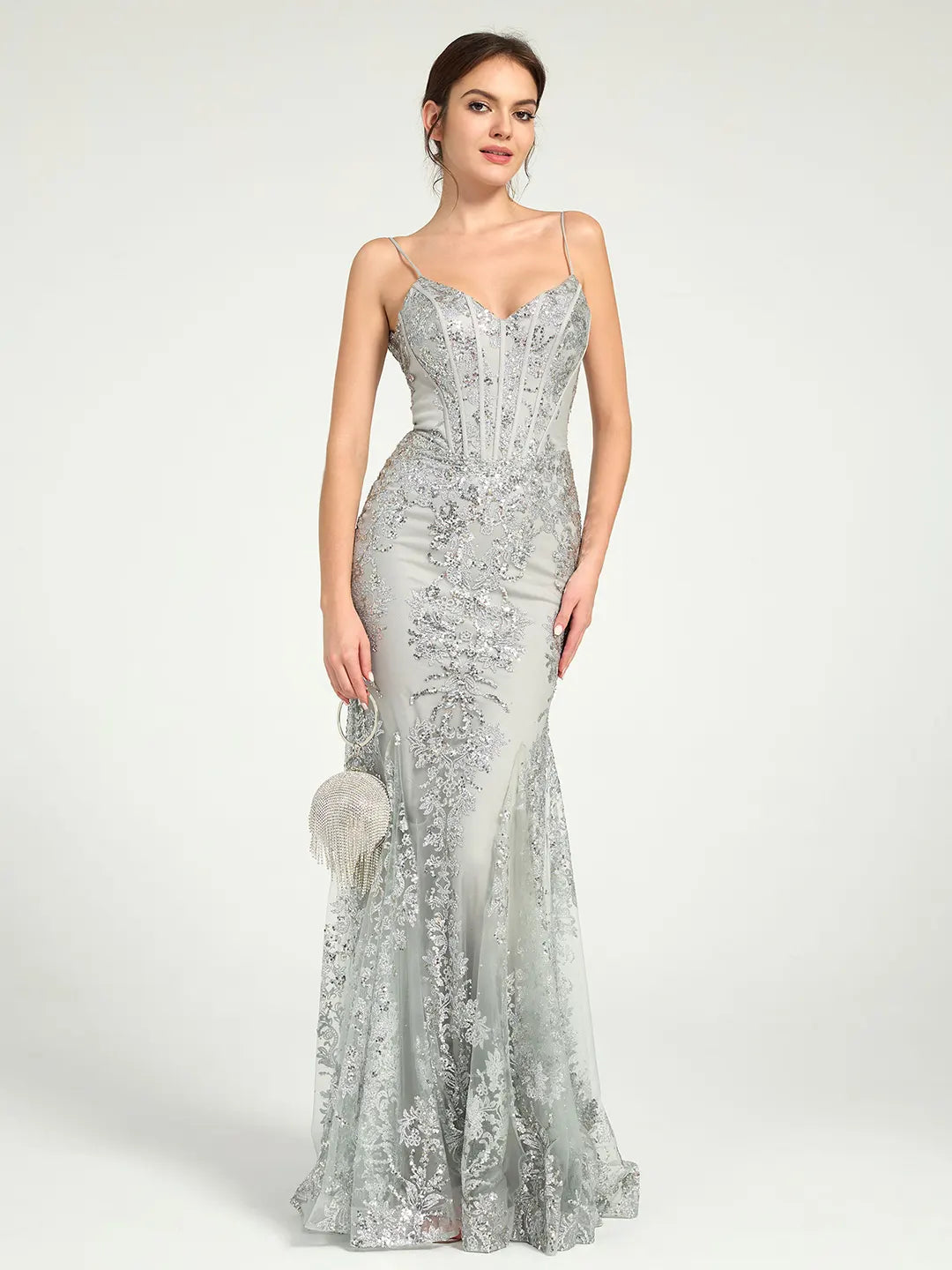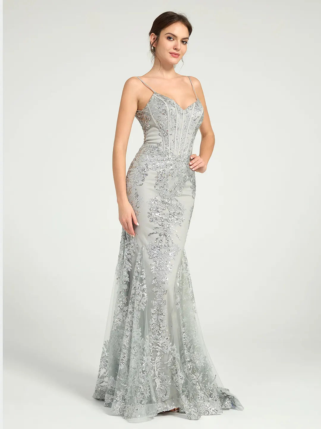 Shine and enchant in this Silver Long Fit & Flare Corset Prom Dress, crafted to make you feel like royalty at any special event. Featuring a striking sweetheart neckline and a structured corset bodice with intricate boning, this gown beautifully enhances your silhouette. Glittering floral embellishments add a luxurious touch to the shimmering silver fabric, while the mermaid-style fit-and-flare design creates a graceful and flattering shape that moves elegantly with you.