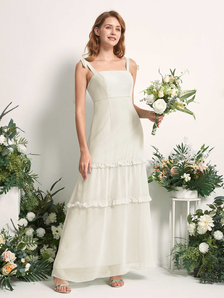 The Kaiya Chiffon Dress is a stunning sleeveless maxi with a flowing silhouette. Featuring a straight neckline, spaghetti straps, and delicate ruffles, this A-line dress is perfect for bridesmaids. Available in a variety of colors.