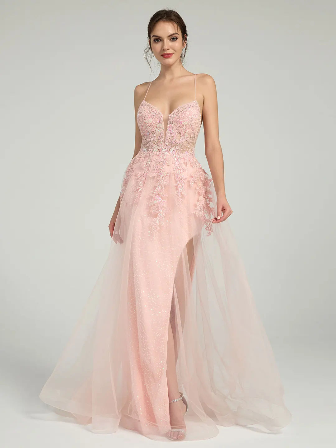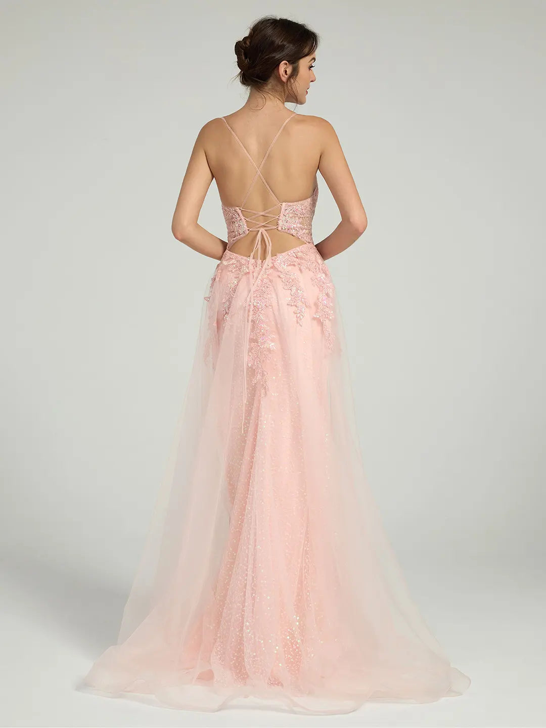 Crafted from floral lace adorned with shimmering sequins, this dress sparkles beautifully under the light. The open back with lace-up detailing adds a playful yet elegant touch, while the high waist and flowing A-line silhouette ensure a flattering fit. A side leg slit completes the look with effortless glamour, making this dress ideal for weddings, proms, evening galas, and formal parties.