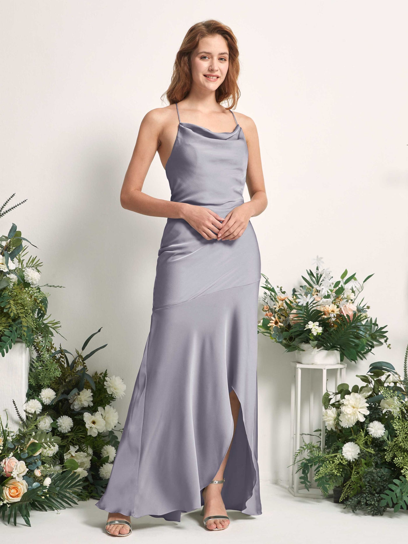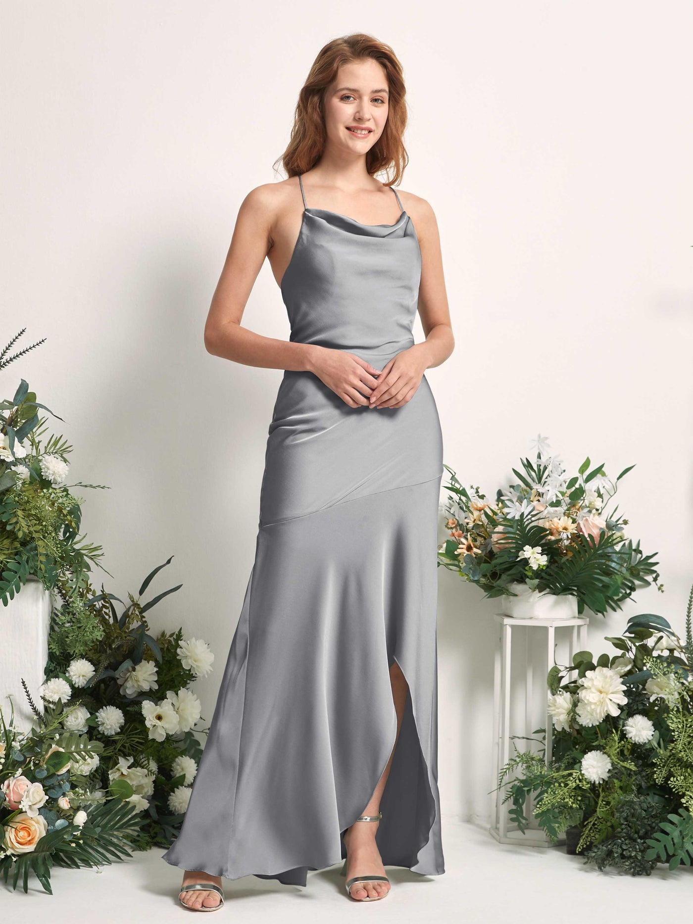 Carlyna Florence Mermaid Steel Gray Satin Bridesmaid Dress Maxi Sleeveless Cowl Neck Dress Front View