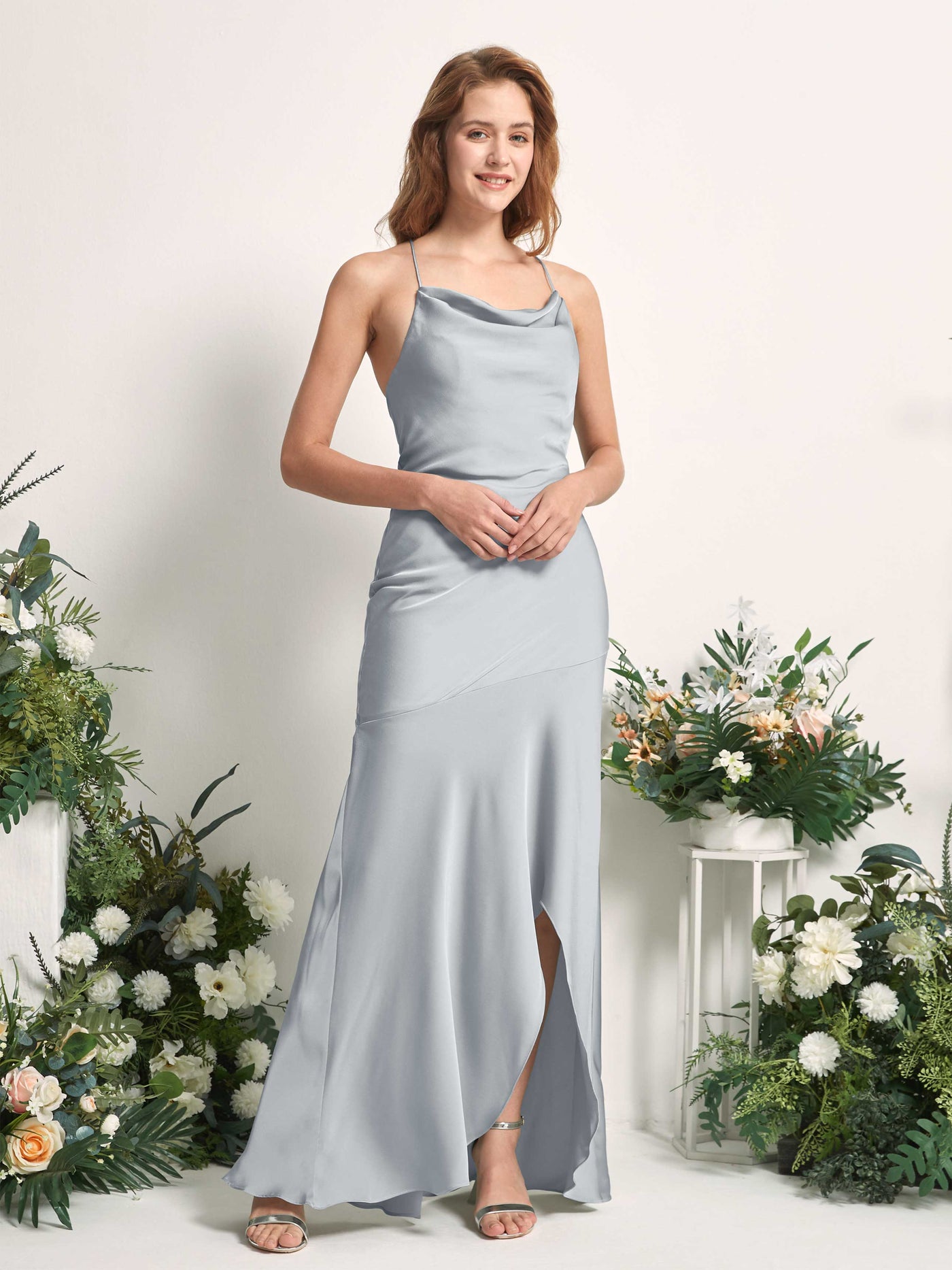 Carlyna Florence Mermaid Dove Satin Bridesmaid Dress Maxi Sleeveless Cowl Neck Dress Front View