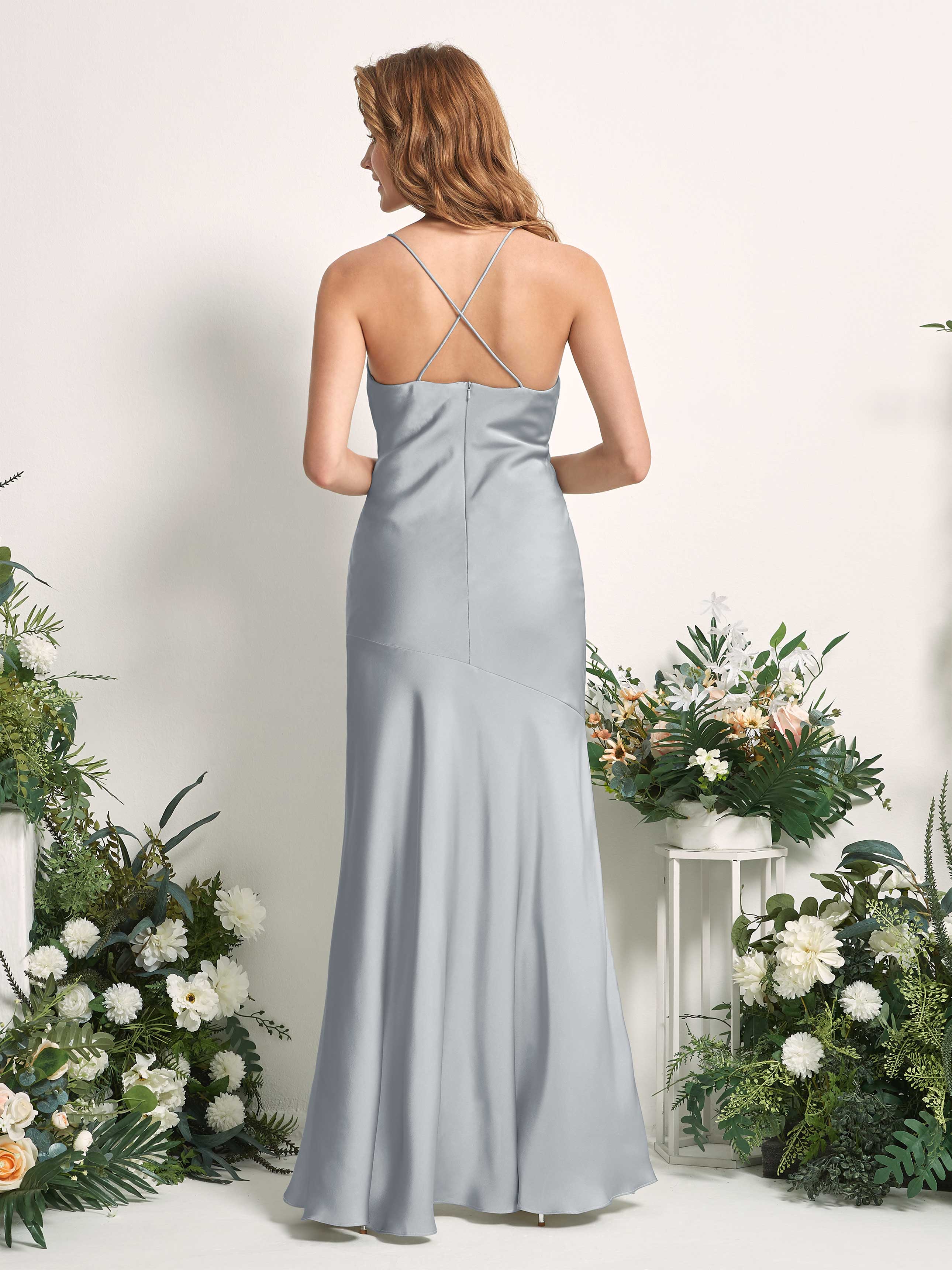 Carlyna Florence Mermaid Steel Gray Satin Bridesmaid Dress Maxi Sleeveless Cowl Neck Dress Back View