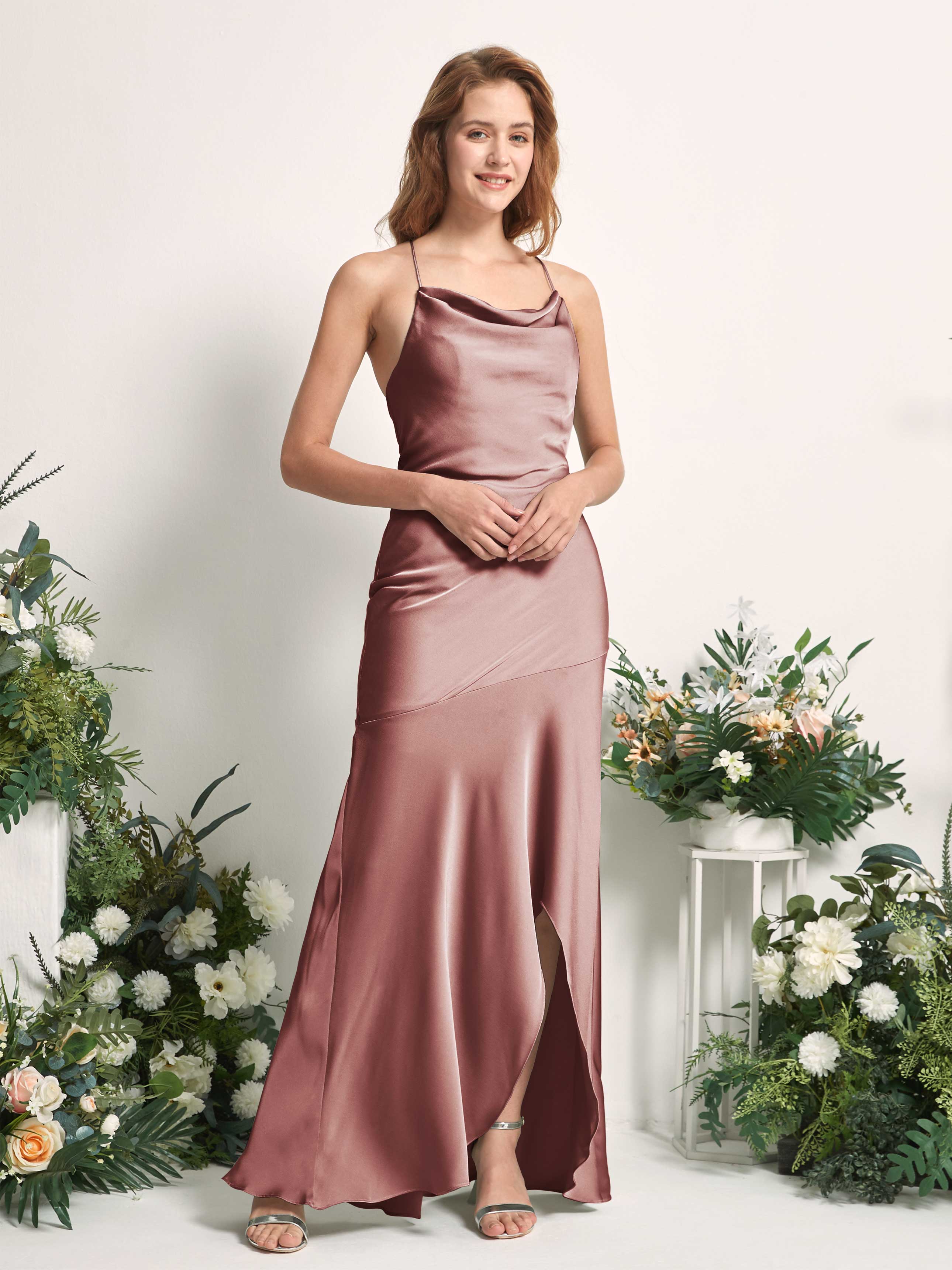 Carlyna Florence Mermaid Dusty Rose Satin Bridesmaid Dress Maxi Sleeveless Cowl Neck Dress Front View
