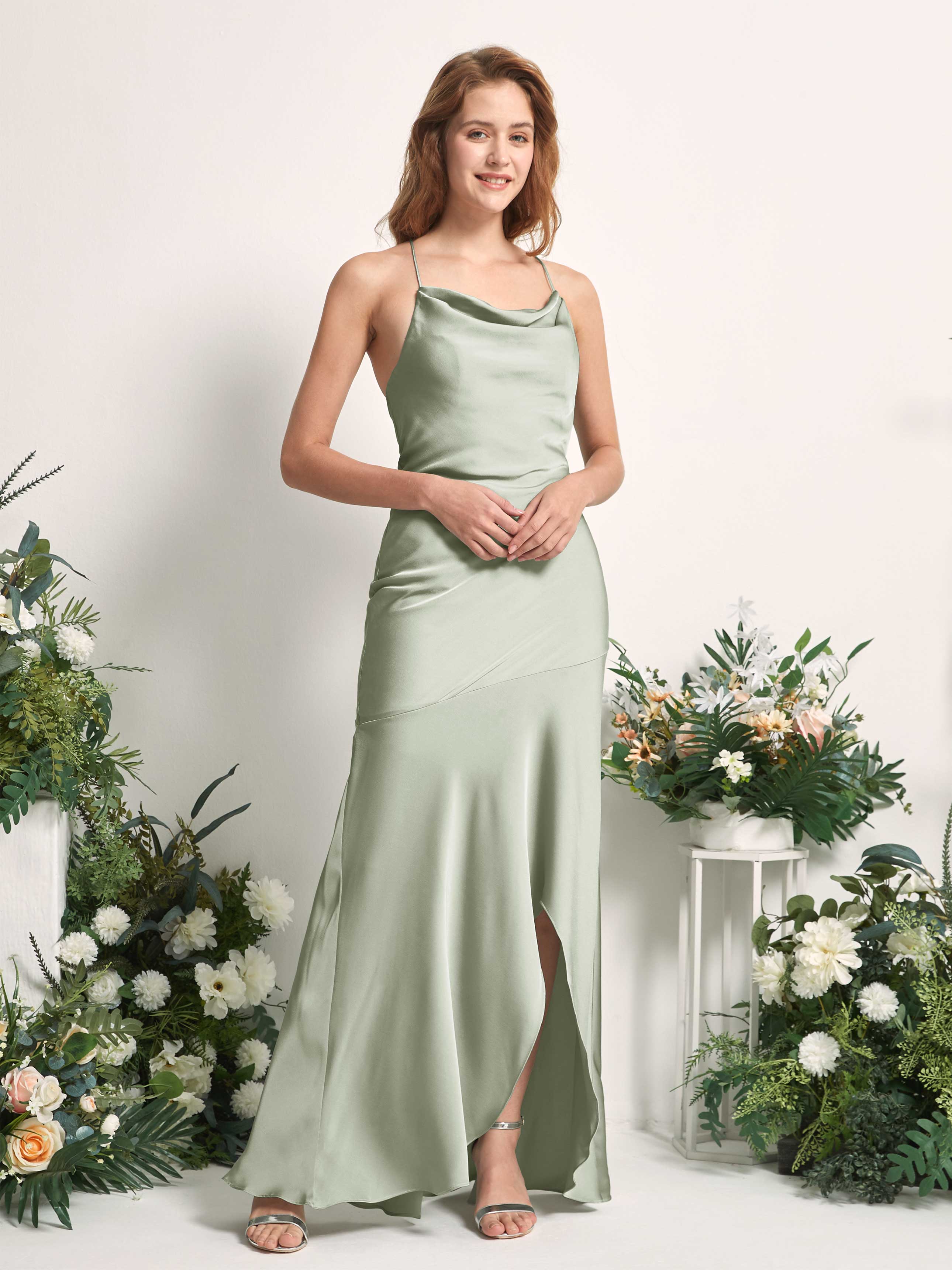 Carlyna Florence Mermaid Sage Green Satin Bridesmaid Dress Maxi Sleeveless Cowl Neck Dress Front View