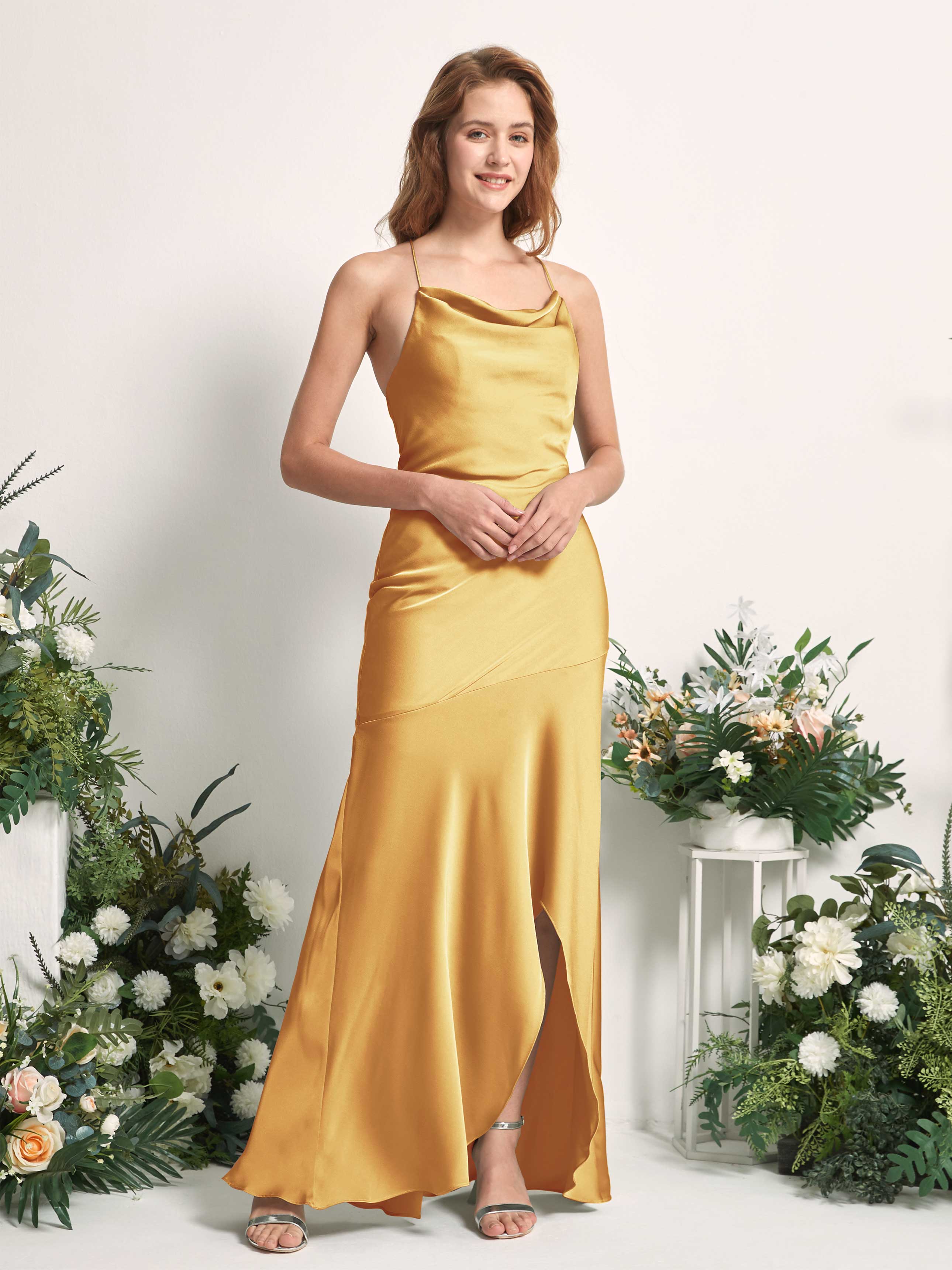 Carlyna Florence Mermaid Canary Satin Bridesmaid Dress Maxi Sleeveless Cowl Neck Dress Front View