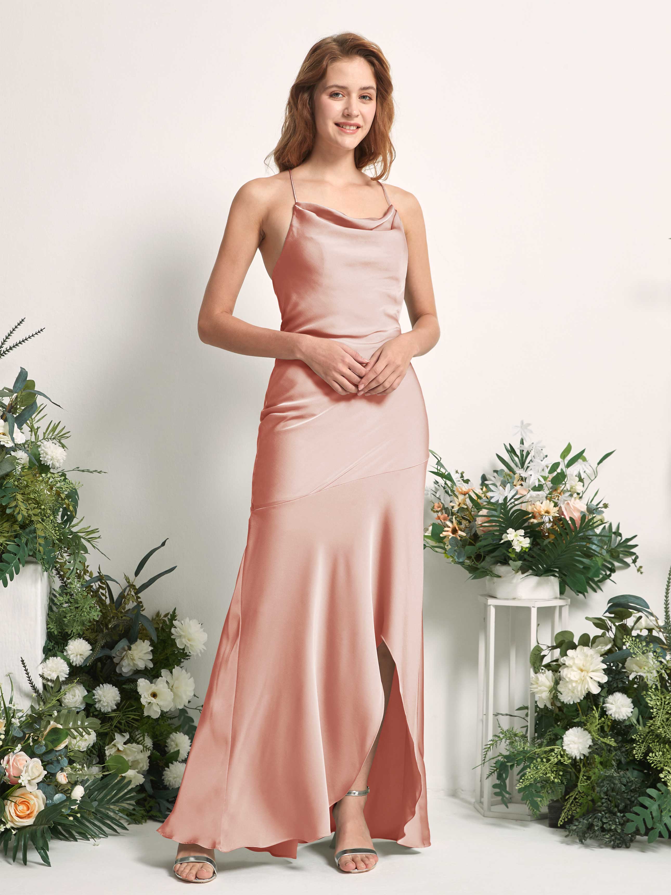 Carlyna Florence Mermaid Desert Rose Satin Bridesmaid Dress Maxi Sleeveless Cowl Neck Dress Front View