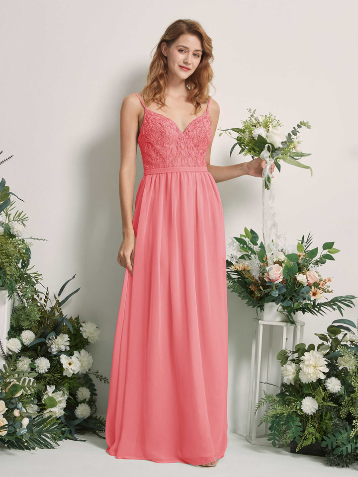 The Alexandra Beaded Chiffon Dress is a romantic maxi dress with a flowing silhouette and delicate beading. Available in various necklines (V-neck, sweetheart, spaghetti strap), it's perfect for bridesmaids.