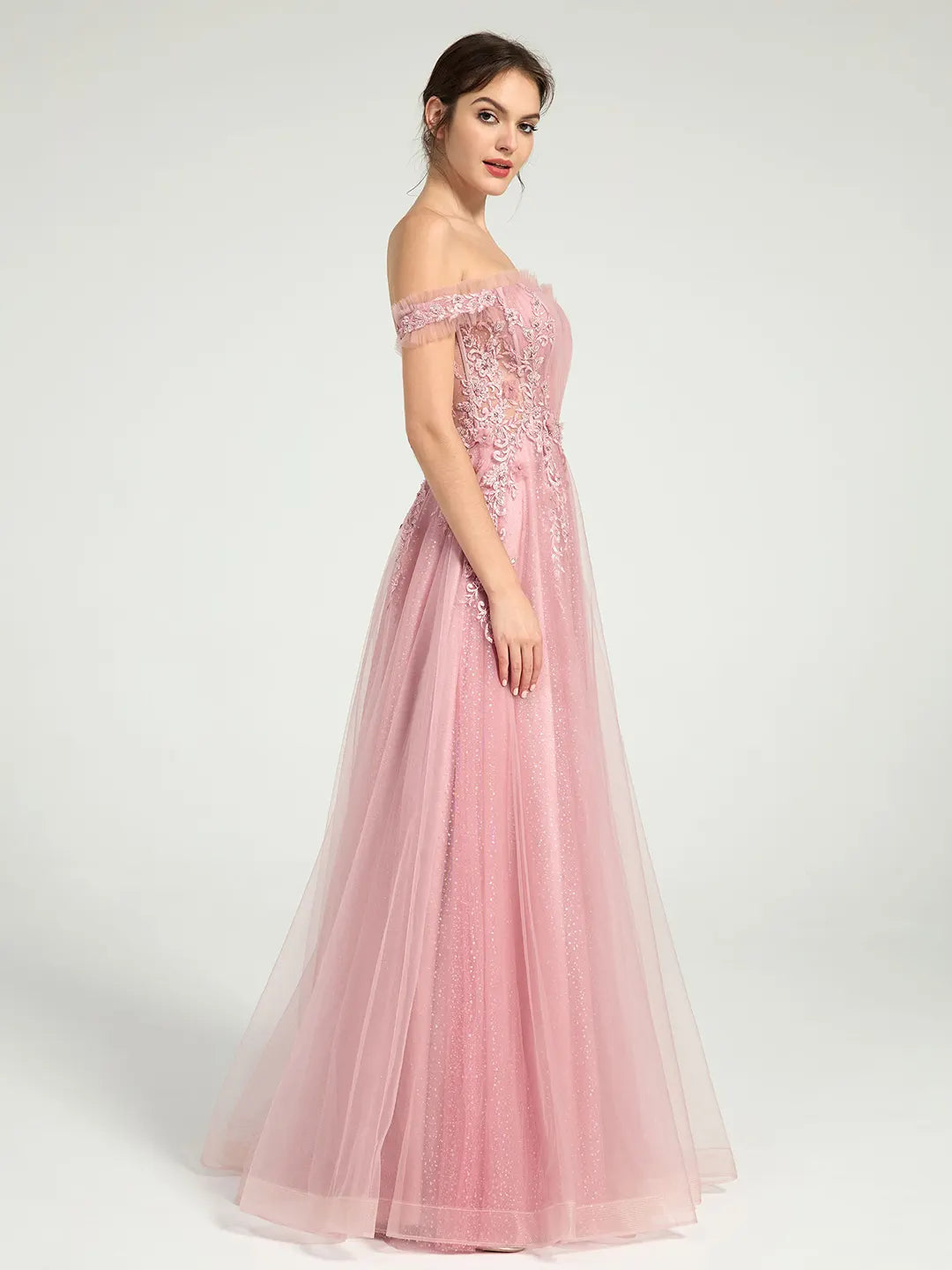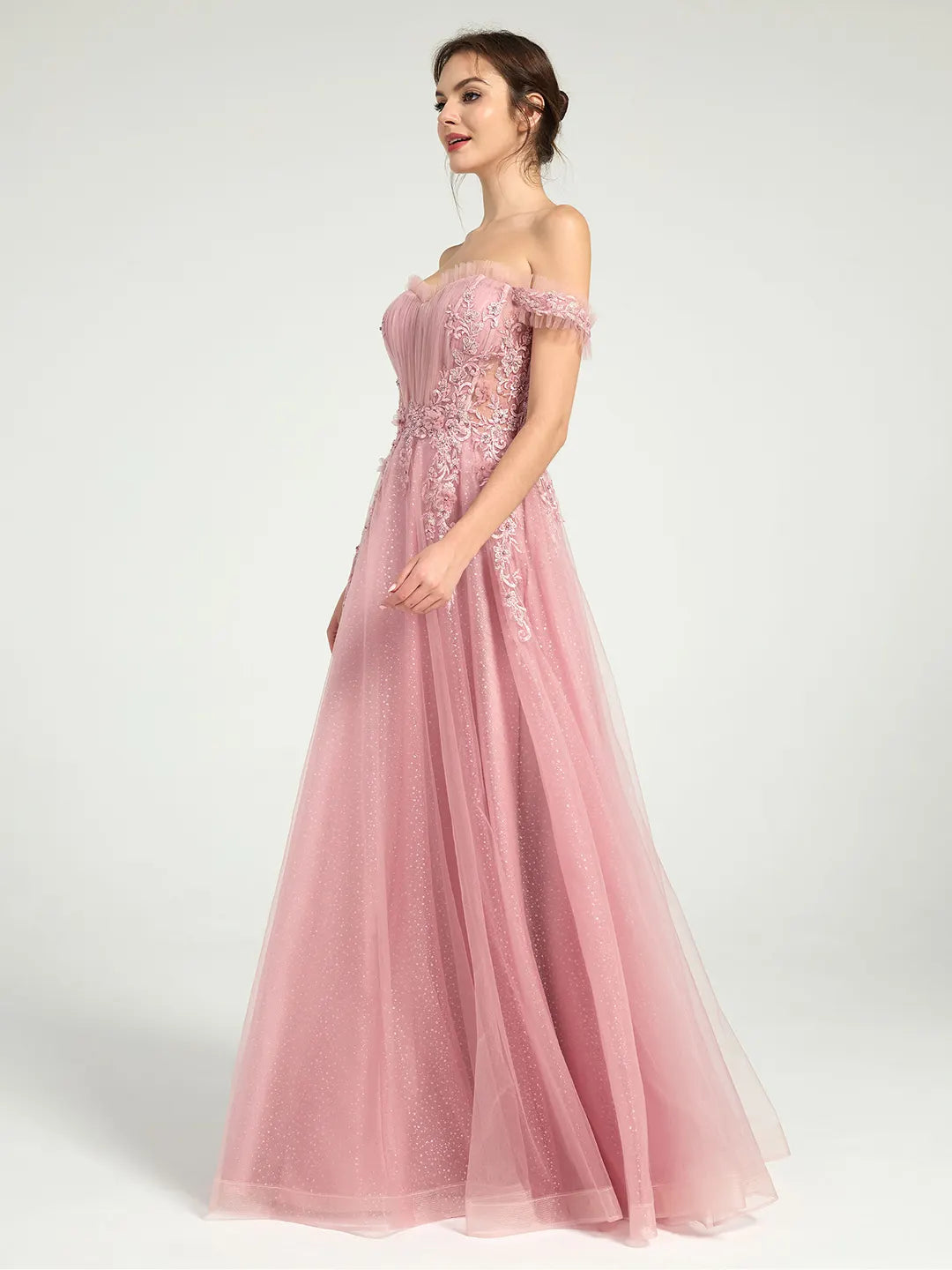 Dazzle in this breathtaking pastel pink ball gown, designed to make you feel like a modern princess at weddings, proms, and other formal occasions. This exquisite A-line dress features an off-the-shoulder neckline with an elegant ruched bodice, adorned with intricate beading, sequins, and rhinestone details. The glitter tulle fabric shimmers with every movement, while the high-waist empire silhouette accentuates your figure, adding a touch of regal sophistication. The open lace back with a low-cut design provides a captivating finish, ensuring you look stunning from every angle.