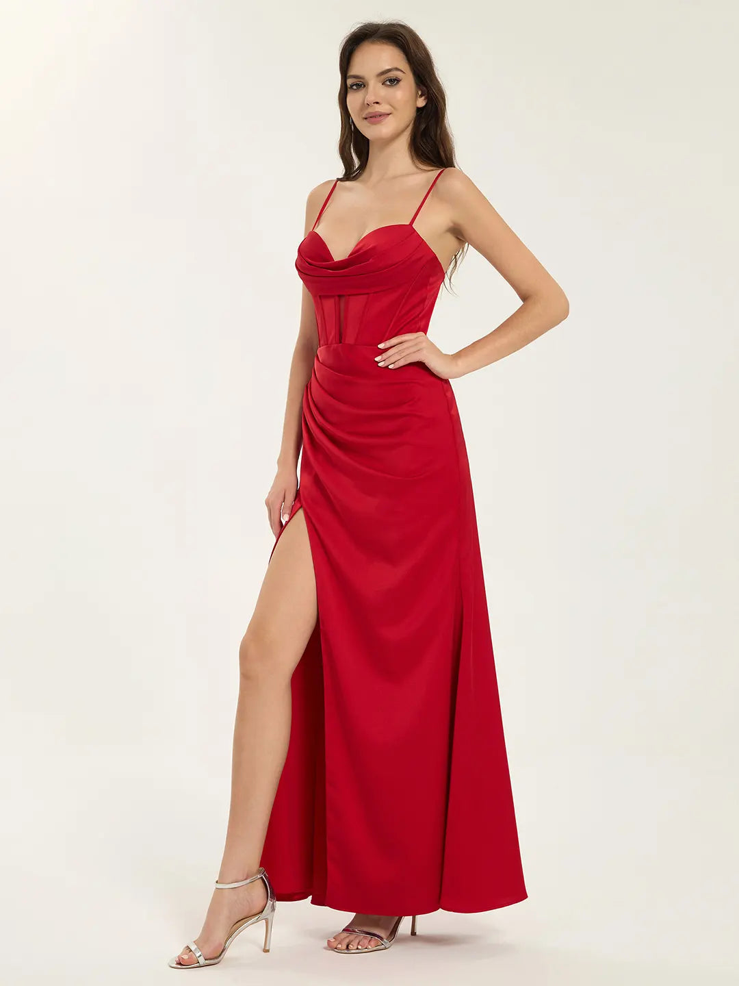 Satin Draped Corset Maxi Dress with Cowl Neck and Leg Slit