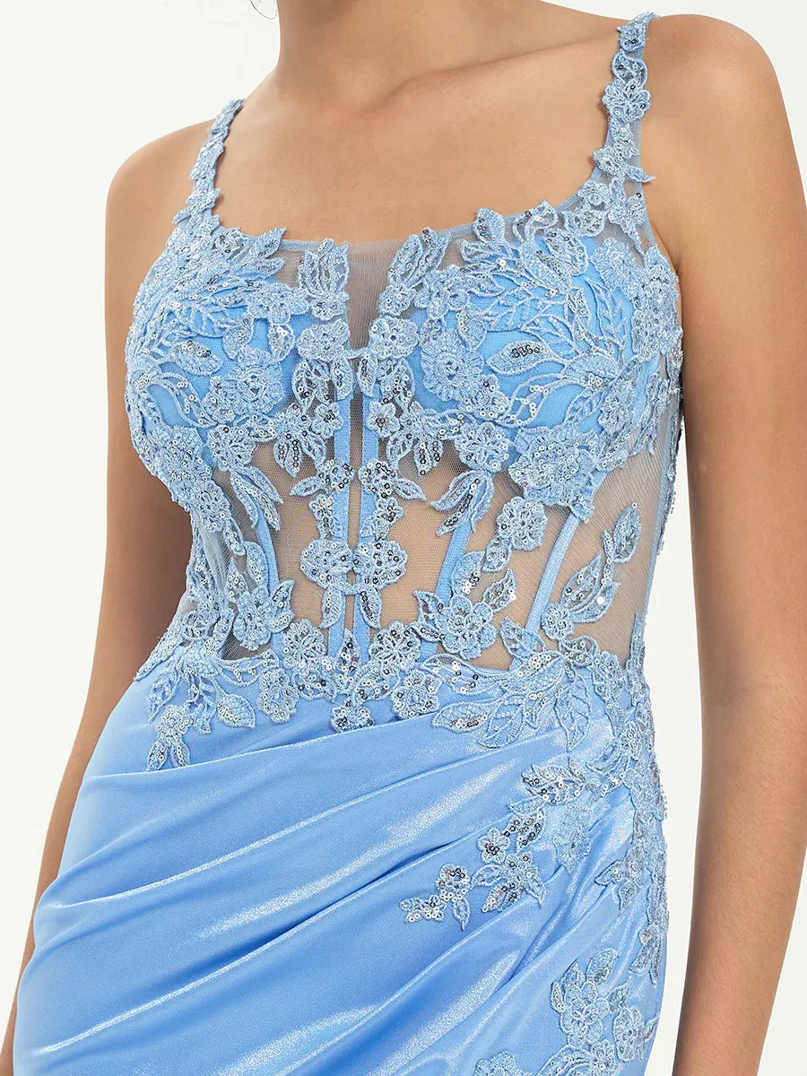 Scoop Neck Satin Lace Mermaid Gown with Sequin Appliqué and Leg Slit